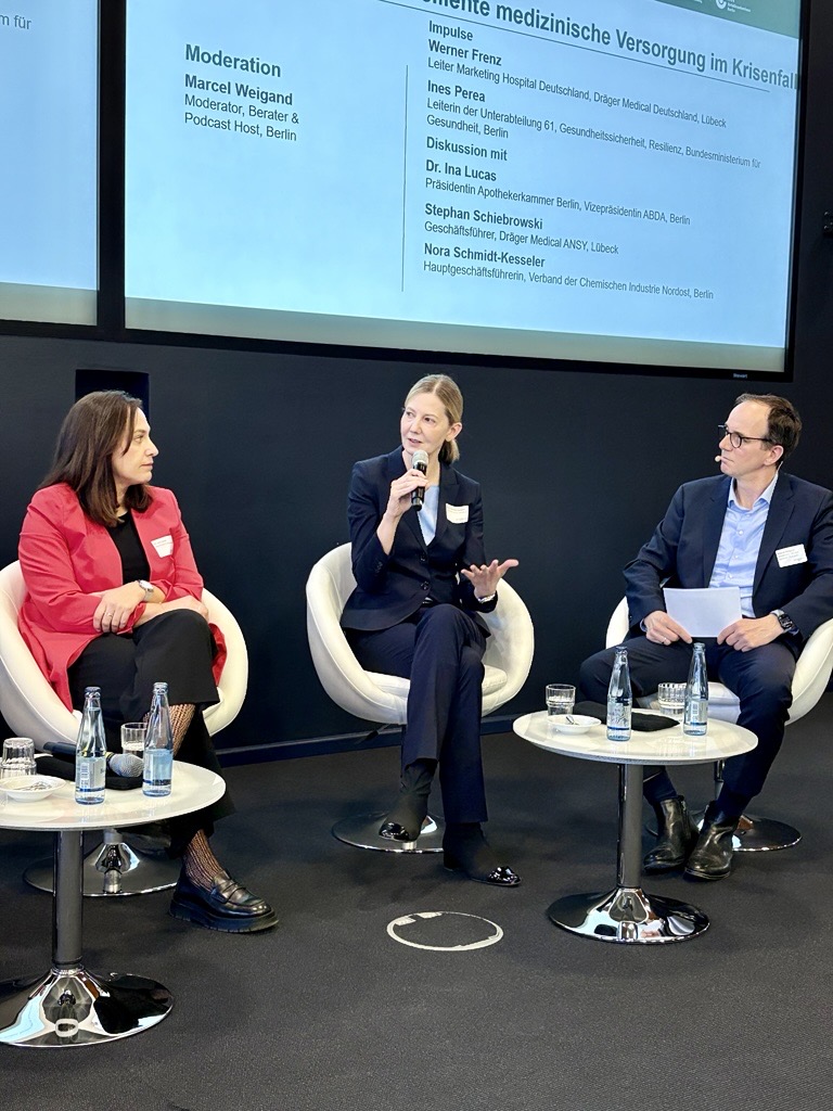 Die Hauptgeschäftsführerin diskutierte auf dem Panel „Strategien für eine resiliente medizinische Versorgung im Krisenfall" – gemeinsam mit Dr. Ina Lucas, Präsidentin der Apothekerkammer Berlin und Vizepräsidentin der ABDA, sowie Stephan Schiebrowski, Geschäftsführer von Dräger Medical, Lübeck.