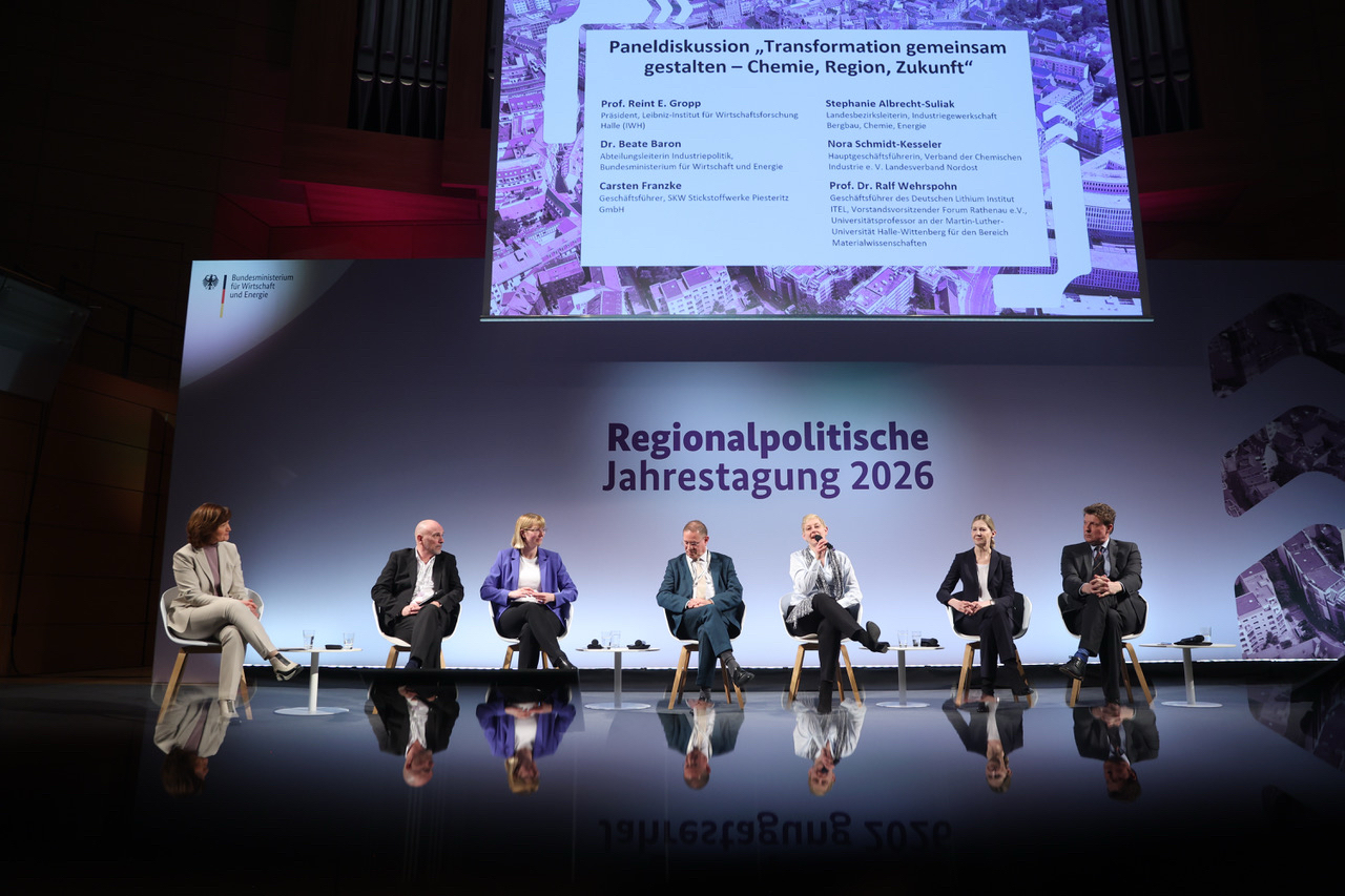 Auf der Regionalpolitischen Jahrestagung 2026 des Bundesministeriums für Wirtschaft und Energie in Halle (Saale) hat Nora Schmidt-Kesseler, Hauptgeschäftsführerin des VCI Nordost über die Zukunft der Chemiebranche diskutiert.